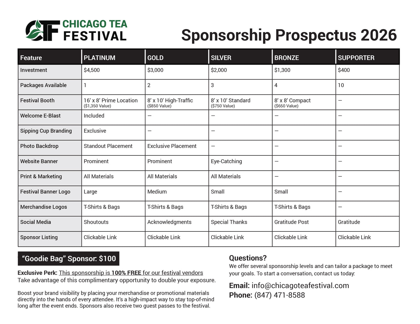 - Festival Booth (8’ x 8’, $650 value): Connect directly with tea lovers.